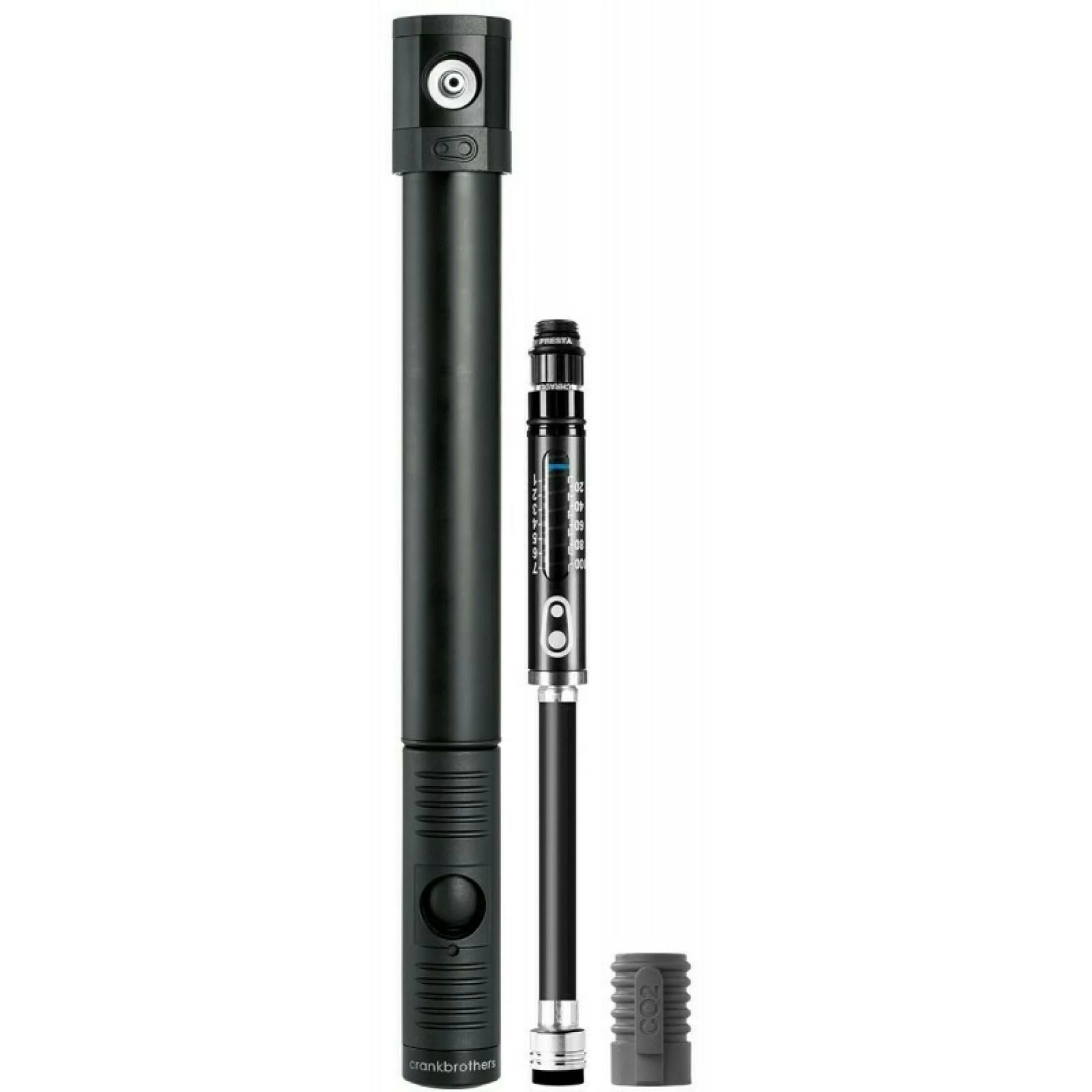 Une pompe équipée d’un gonfleur de CO2 (presta uniquement), d’un manomètre à air, d’une tête magnétique avec collier de torsion, une poignée pliante et verrouillable et d’ un adaptateur de valve Presta / Schrader .